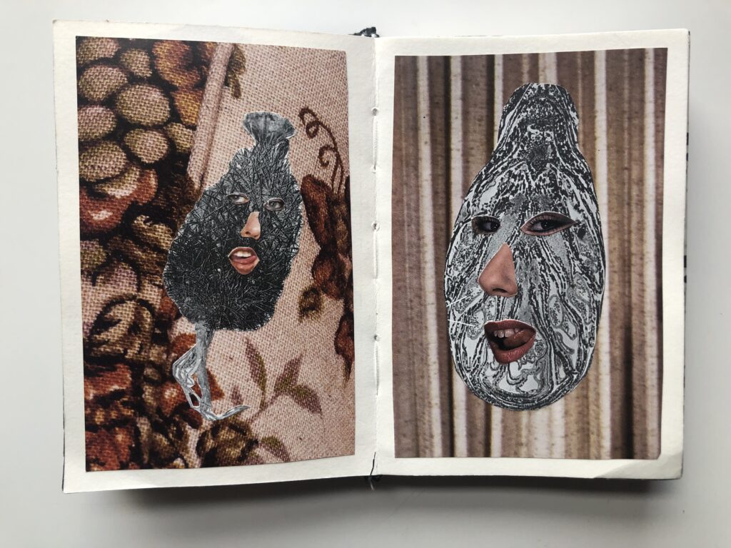 Made from pages in the Fall 2024 issue of Paris/Atlantic (The American University of Paris) and fragments of fabric featured in Textiles of Central and South America (Crowood Press, 2006).